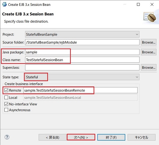 プロジェクト名 に新規プロジェクト名StatelessBeanSampleを入力して、