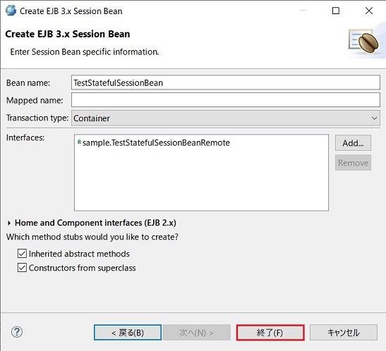 ステートフルセッションBean と SingletonセッションBean の手順については、適宜、該当箇所の読み替えでご理解ください。