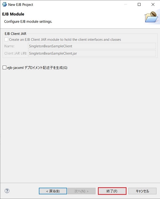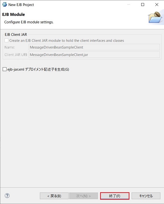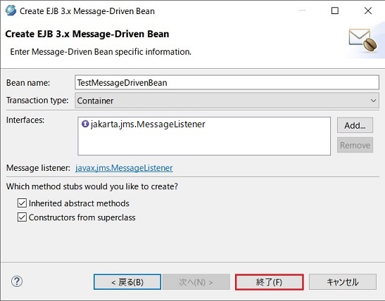 次のEJB 3.x メッセージ駆動型 Bean の作成画面で、終了をクリックします。