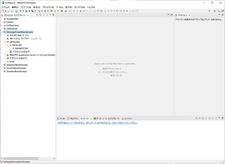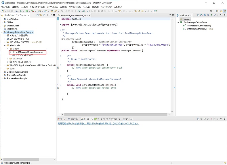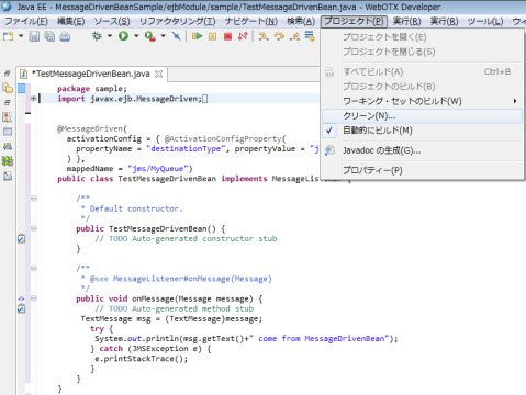 MessageDrivenBeanSampleプロジェクトにメッセージ駆動型Beanのソースが追加されます。