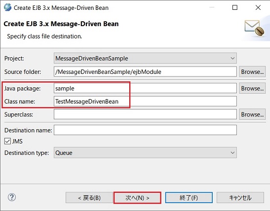 EJB 3.x メッセージ駆動型 Bean の作成画面が表示されます。
