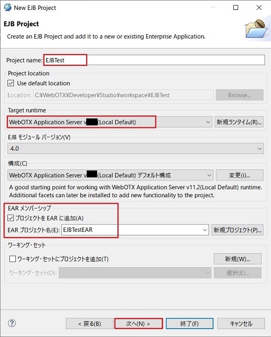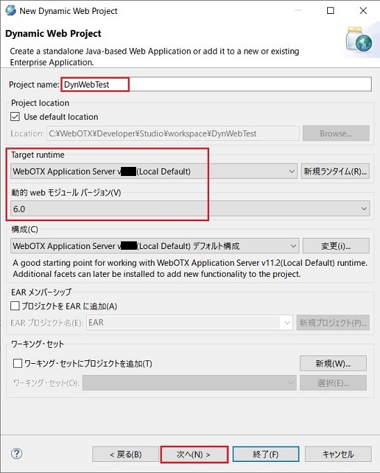 ターゲット・ランタイム でWebOTX Application Server <当該バージョン>(Local Default)を選択します。