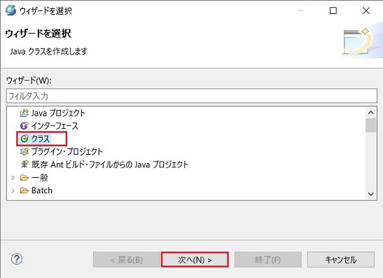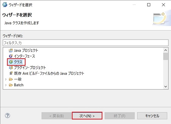 メニューの ファイル > 新規 > その他... を選択して、新規 ウィザード画面を表示します。クラス を選択して、次へをクリックします。