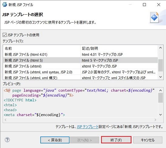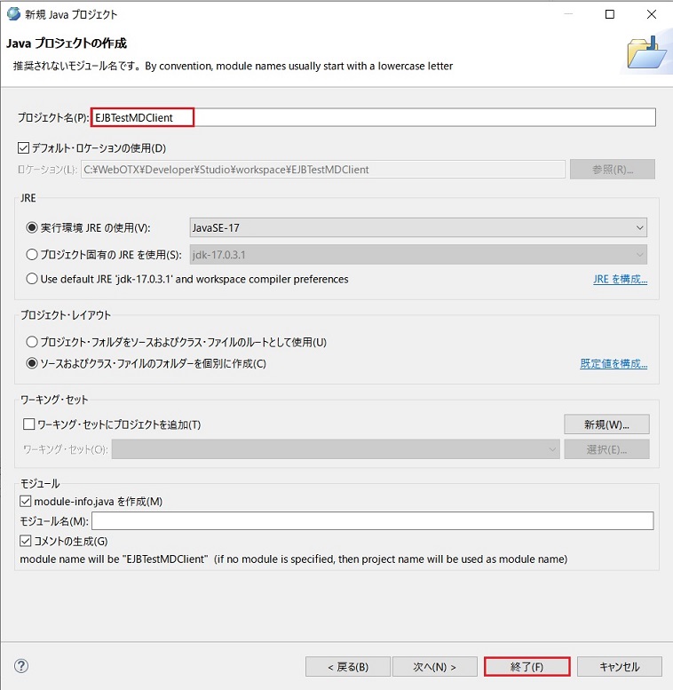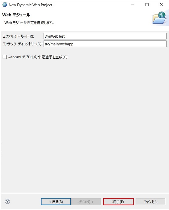 表示されたWeb モジュール 画面に 終了 をクリックすると、プロジェクトDynWebTestが作成されます。