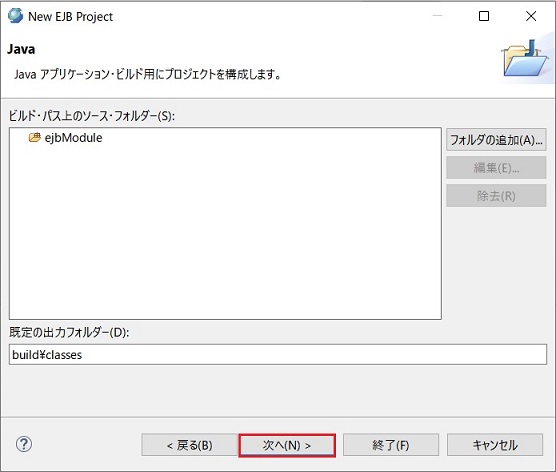 EJB モジュール バージョン が自動的に4.0となるのを確認した後、次へ をクリックします。