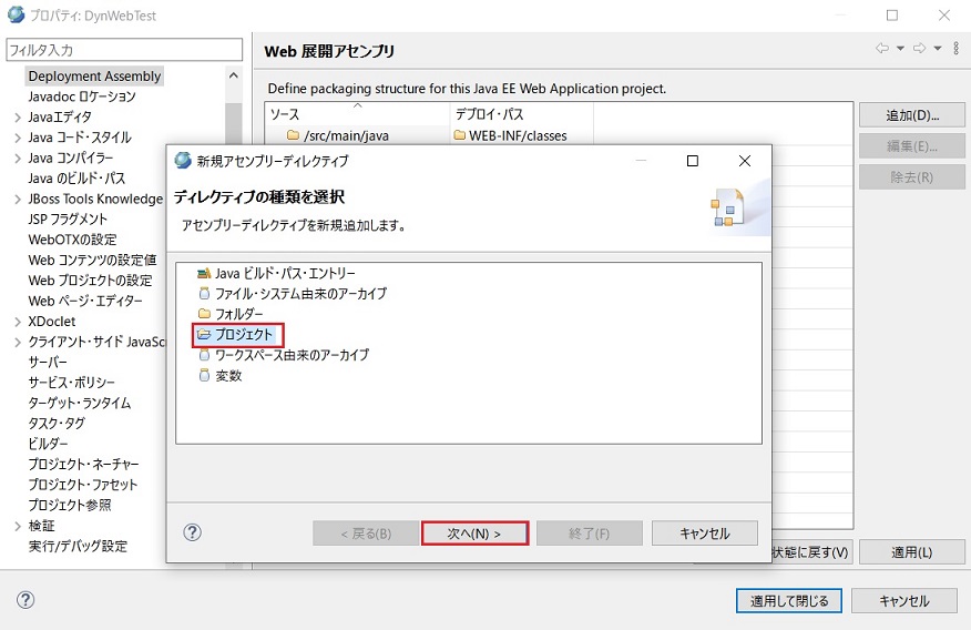 動的 Web プロジェクト DynWebTest が存在する場合には、DynWebTest 以外のプロジェクト名で作成し、以降の記載では、