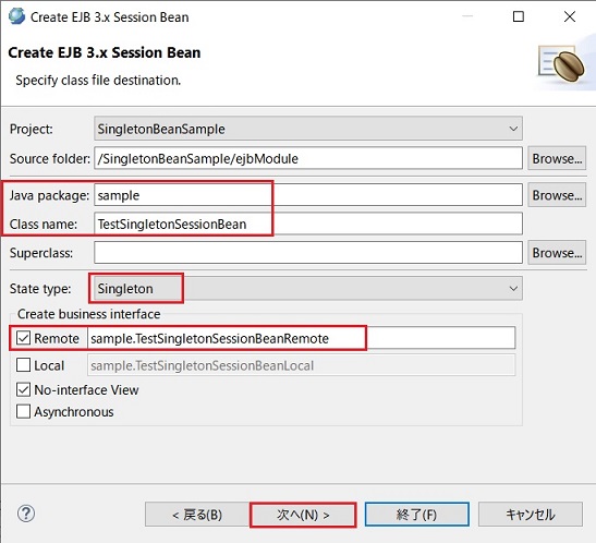 を、ここまでに作成したSingletonセッションBean の場合に合わせて、変更しながら進める必要があります。