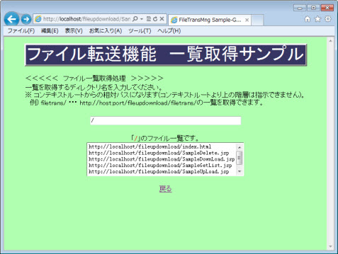 http://Webサーバ名(ドメイン省略不可):ポート番号/fileupdownload/SampleUpLoad.jsp