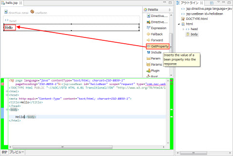 Hello<jsp:getProperty name="helloBean" property="name" /><br>