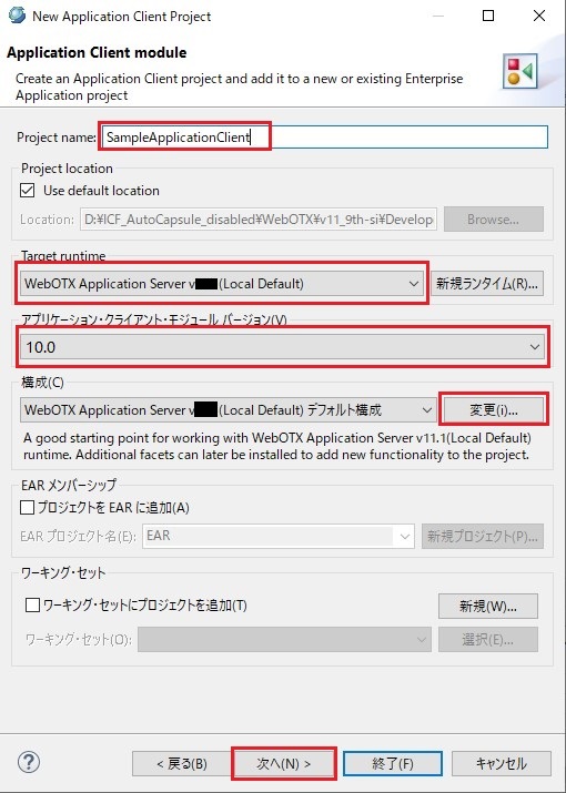 ターゲット・ランタイム でWebOTX Application Server <当該バージョン>(Local Default)を選択します。