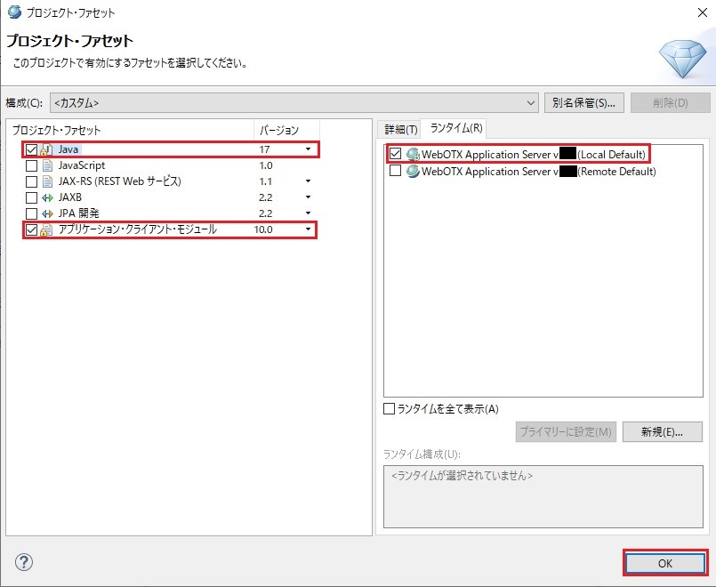 ランタイムリストにWebOTX Application Server <当該バージョン>(Local Default)がONの状態を確認ください。
