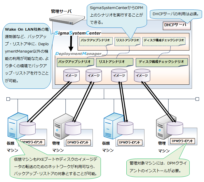 SigmaSystemCenterでは、Wake On LAN以外の電源制御などバックアップ・リストア中に、DeploymentManager以外の機能の利用が可能なため、より多くの環境でバックアップ・リストアを行うことが可能です。