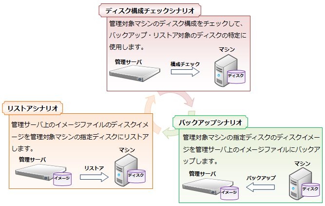 DeploymentManagerのバックアップ・リストアの機能により、管理対象マシンのシステム(OS)がインストールされているディスクを、ディスク単位、またはディスク内のパーティション単位で、バックアップ・リストアを行うことができます。