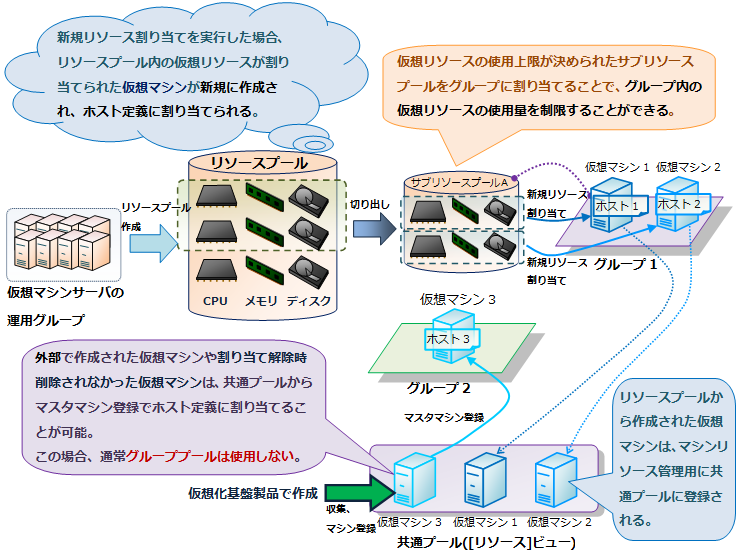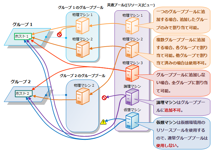 プールには、主にマシンリソースの割り当ての管理に使用するグループプール/共通プールと、仮想マシンに割り当てる仮想リソースの管理に使用するリソースプールの2種類があります。
