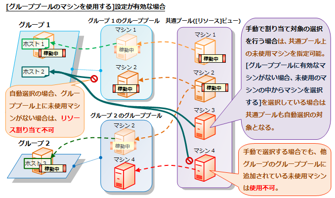 [グループプールのマシンを使用する] | グループプール上の未使用マシンが自動的に選択されます。共通プールのマシンは選択されません。 | グループプールと共通プールの両方の未使用マシンを選択可能です。 |