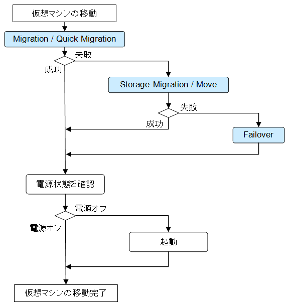 Migration / Quick Migration、Storage Migration / Move、Failoverのすべての動作を行うように指定した場合は、まずMigration、またはQuick Migrationを行います。Migration / Quick Migration処理が仮想マシンサーバの環境や稼動状況などにより失敗した場合は、Storage Migration / Moveを行います。Storage Migration / Move処理が失敗した場合は、Failover処理を行います。