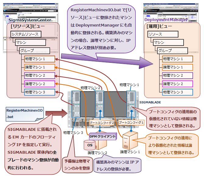 登録対象のブレードが格納されるSIGMABLADE筐体を指定して、RegisterMachinevIO.batを実行すると、次のイメージ図のように、指定のSIGMABLADE筐体内の全ブレードについて、ブートコンフィグの適用状況に応じて論理マシンと物理マシンの2種類のマシンが[リソース]ビューとDeploymentManagerに登録されます。対象のSIGMABLADE筐体は、SIGMABLADEに搭載されるEMカードのフローティングIPアドレスにより指定します。
