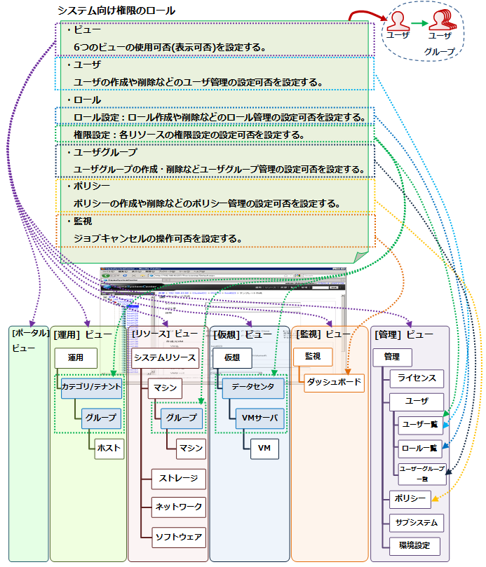 システム向け権限のロールは、SigmaSystemCenterのシステム機能について、ユーザが使用可能な範囲を定義するためのものです。ユーザ管理やポリシー管理などリソース単位での設定を必要としない機能を対象とします。以降、システム向け権限のロールを、ロール(システム)として説明します。