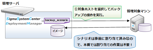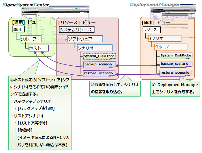 バックアップ・リストアシナリオを、DeploymentManagerのWebコンソール上で作成します。本節では、バックアップ・リストアシナリオを、SigmaSystemCenterのWebコンソールの運用グループ配下で稼動中の管理対象マシンごとに作成する場合の説明を行います。