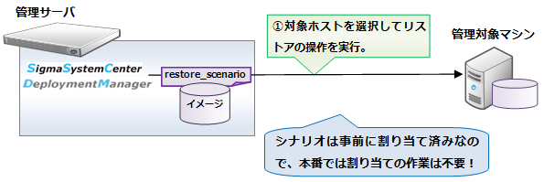 リストアの操作以外では、指定ソフトウェア配布でリストアシナリオを指定して実行することでも可能です。