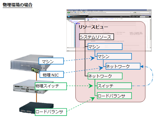物理環境でネットワーク制御を行うためには、マシン、物理スイッチ、ロードバランサの登録が必要です。マシンには、NICの登録が必要です。それぞれ、次の図のように登録を行います。