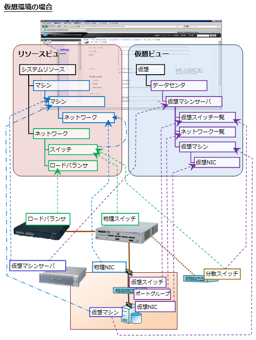 仮想スイッチとポートグループは、仮想マシンサーバのデバイスの1つとして登録されます。仮想スイッチは、[仮想]ビュー上で明示的に作成や登録することはできません。
