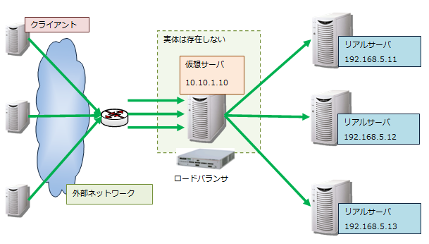 リアルサーバとは、仮想サーバの実体となるサーバです。クライアントからの仮想サーバに対するアクセスは、ロードバランサにより任意のリアルサーバに振り分けられます。