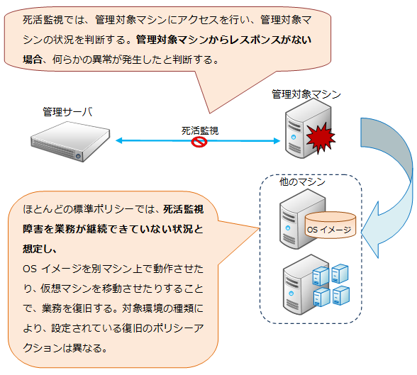 死活監視では、SigmaSystemCenterは、定期的に管理対象マシンが動作しているかどうかのチェックを行い、管理対象マシンから反応がない場合に、異常を通報する監視を行います。監視対象のマシンの種類により、死活監視の機能を提供する製品・コンポーネントは異なります。「2.5.2. 管理対象種類別の使用可能製品一覧」を参照してください。なお、BMC死活監視については、「2.5.6. BMC死活監視」を参照してください。