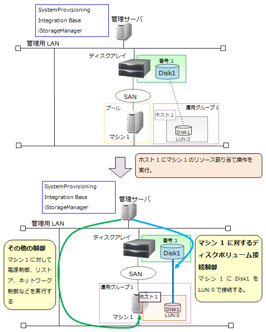 ディスクボリューム接続制御では、リソース割り当てを行う管理対象マシンから、対象ストレージ上の指定ディスクボリュームが使用できるように、ディスクアレイに対してアクセスコントロール制御が行われます。