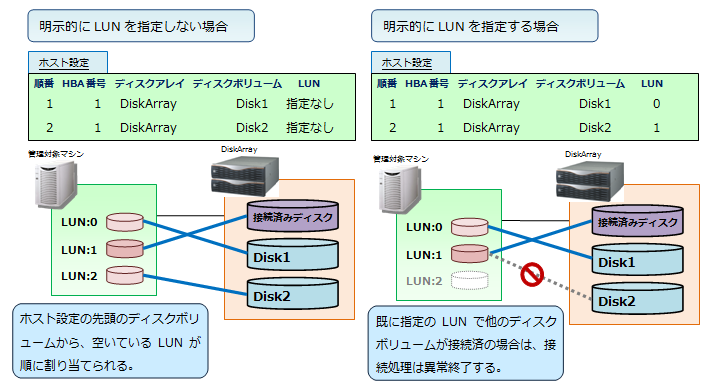 指定番号のLUNがディスクボリュームに割り当てられます。指定した番号が既に割り当て済みの場合は、ディスクボリュームの接続処理は異常終了します。(*1)