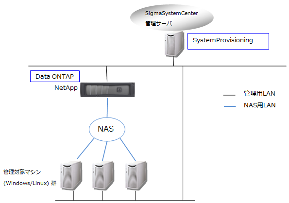 NetAppストレージと管理対象マシンは同一のNAS のネットワークに接続します。NetAppはSANでの利用も可能ですが、SigmaSystemCenterは対応していません。また、利用可能なプロトコルはNFSのみです。CIFSを使用する環境のストレージ制御には対応していません。