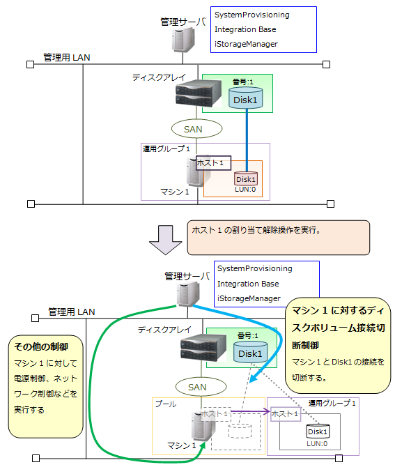 稼動中の運用グループのホストに対して割り当て解除操作を行うと、操作対象となった管理対象マシンに対して、業務から外すための一連のプロビジョニング処理が行われます。