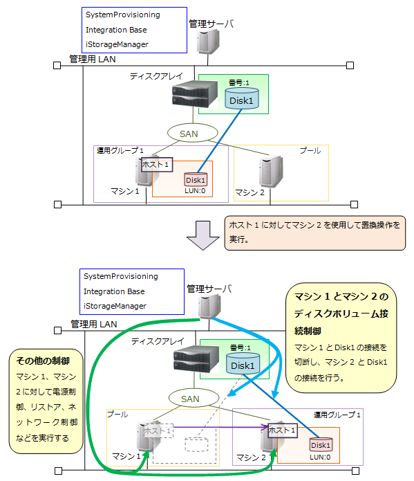 稼動中の運用グループのホストに対して置換操作を行うと、利用中の管理対象マシンから予備機としてプール上で待機している管理対象マシンに使用マシンリソースを切り替えるための一連のプロビジョニング処理が行われます。このとき、ディスクボリューム接続制御もプロビジョニングの処理の1つとして実行されます。