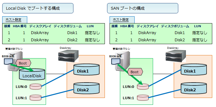 次の図は、ローカルディスクでのブートとSANブートのイメージです。