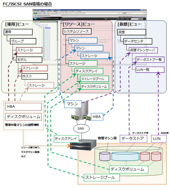SigmaSystemCenterからストレージの制御を実行するためには、制御の対象となる装置や装置内の構成の情報やディスクボリューム接続制御の定義をSigmaSystemCenterに登録する必要があります。