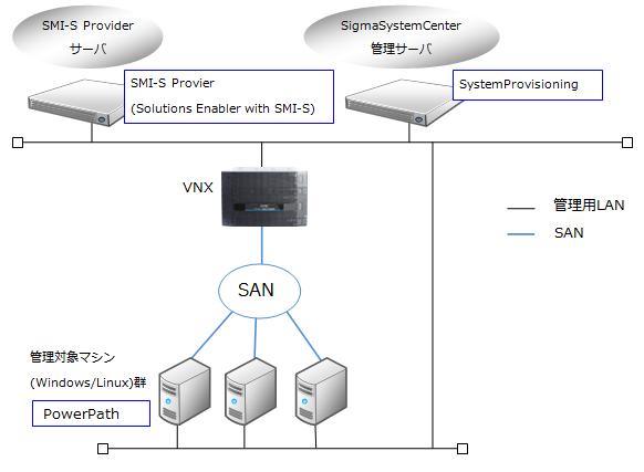 VNX(SMI-S)の制御を行うためには、SMI-S Providerが必要です。SMI-S Providerは、SystemProvisioningと同一の管理サーバと別管理サーバのどちらの構成でも利用可能です。SMI-S Providerには、Solutions Enabler が含まれています。
