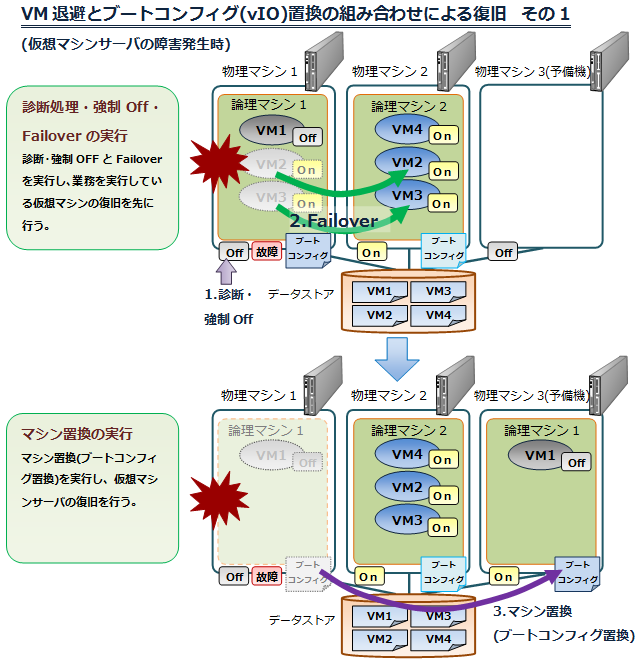 ブートコンフィグ(vIO)置換を、「4.8.1. 仮想マシンサーバダウン時のVM退避」で説明している障害復旧処理と組み合わせて利用します。