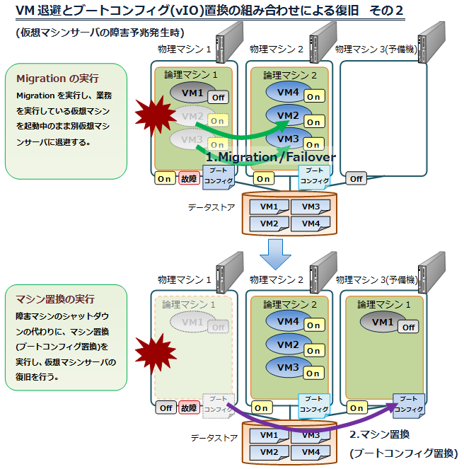 もうひとつの復旧機能は、ブートコンフィグ(vIO)置換により障害が発生した仮想マシンサーバを予備機に切り替える機能です。