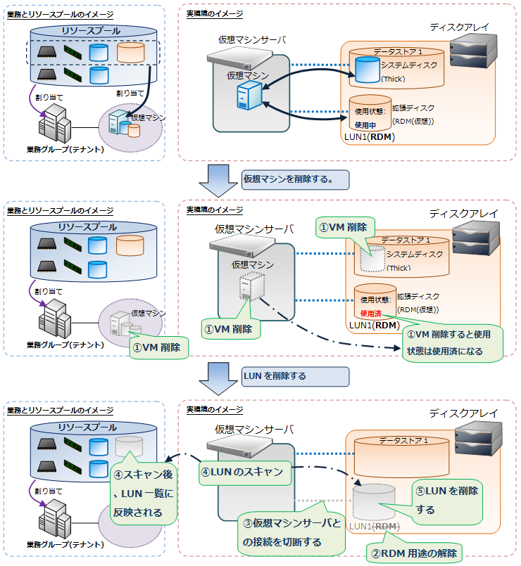 RDM用途で使用中のLUN(ディスクボリューム)の回収方法は、以下のとおりです。