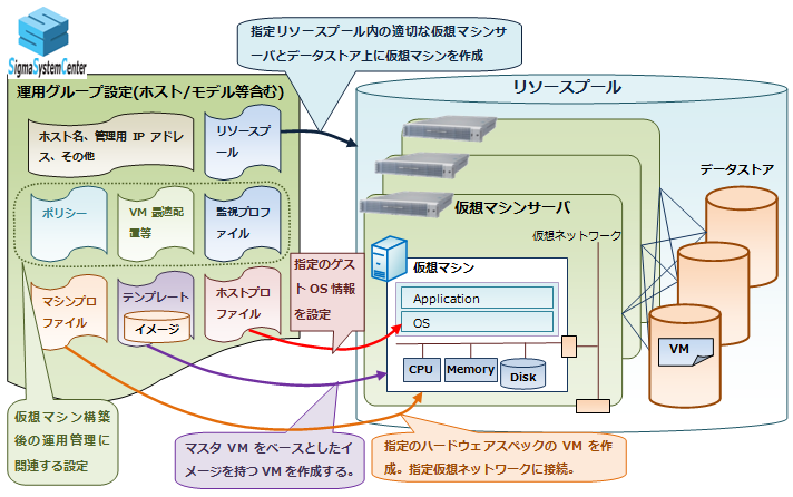 リソースプールは仮想マシンサーバの運用グループで作成し、仮想マシンのグループ、または、上位のカテゴリ、またはテナントに割り当てて使用します。