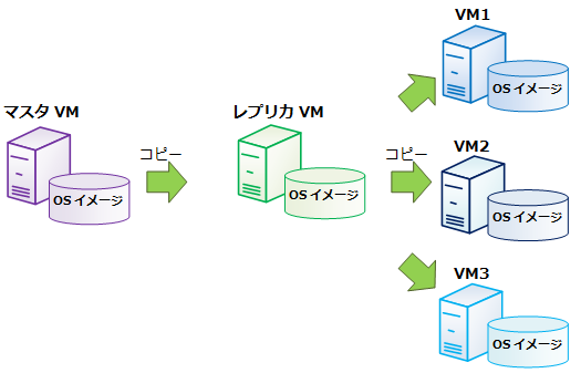 Disk Cloneにより、マスタVMから作成したイメージを元に、仮想マシンを作成することができます。マスタVMから作成したイメージのことをレプリカVMと呼びます。 Differential Cloneと異なり、Disk Cloneで作成した仮想マシンはレプリカVMとの差分ではなく、レプリカVMのイメージがそのままコピーされたものです。 Differential Cloneのように他仮想マシンとのイメージ共有によりディスク容量削減などのメリットはありませんが、イメージを単独で所有しているため他の仮想マシンの動作の影響を受けにくいメリットがあります。