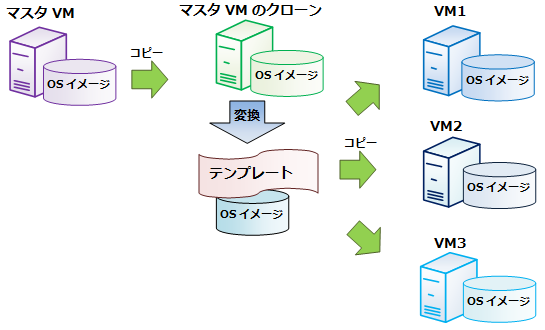 Full Cloneでは、マスタVMから作成した各仮想化基盤製品の標準テンプレートを元に、仮想マシンが作成されます。