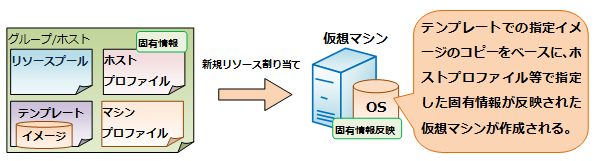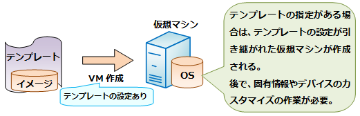 テンプレートを利用することにより、OSのインストール、固有情報の反映など、仮想マシンを構築するために行う一連の作業を自動で行うことができます。