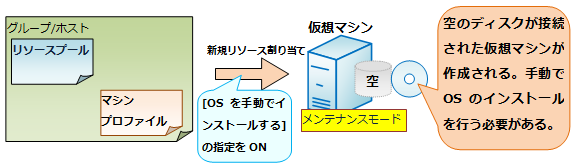 操作実行時に[OSを手動でインストールする]を指定した場合は、テンプレートが使用されず、OSがインストールされていない状態で仮想マシンが作成されます。作成される仮想マシンはメンテナンスモードがオンの状態となります。
