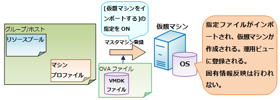 マスタマシン登録の操作を実行したとき、[仮想マシンをインポートする]を指定した場合、指定のファイルがインポートされ仮想マシンが作成されます。インポートの指定がない場合は、[リソース]ビュー上に割り当て対象の仮想マシンが登録されている必要があるため、仮想マシンの作成を行うことはできません。