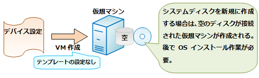 テンプレートを指定しない場合は、仮想マシンの各デバイスの設定が表示されます。システムディスクの指定を新規作成にした場合は、新規作成された空のディスクが接続された仮想マシンが作成されます。デバイスの設定は、[リソース]ビューのマシンプロファイルをコピーすることができます。OSがインストールされていない状態で仮想マシンが作成されるため、作成後にOSのインストール作業が必要です。
