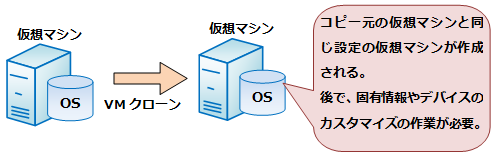 VMクローンを実行すると、指定の仮想マシンサーバ上で指定のコピー元と同じ仮想マシンを作成することができます。後で手動の作業が必要となりますが、仮想マシンの作成のためにさまざまな設定の準備を行う必要はないため、仮想マシンの作成を簡易に実施できる点において、メリットがあります。