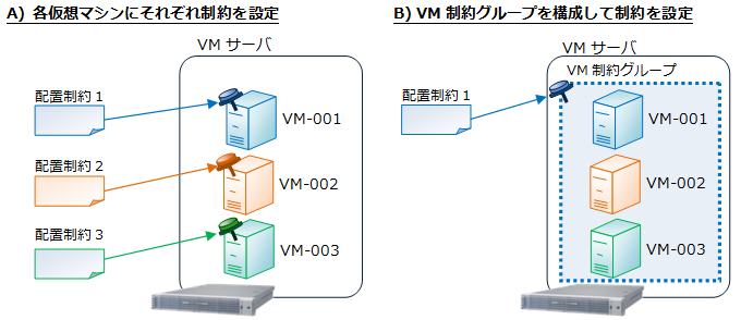 特に、Pin制約の制約先が複数存在するような場合には、A)の例ではVM-004にすべての制約を設定する必要があるため、B)の例のように、VM制約グループを利用することで管理を簡略化することが可能になります。