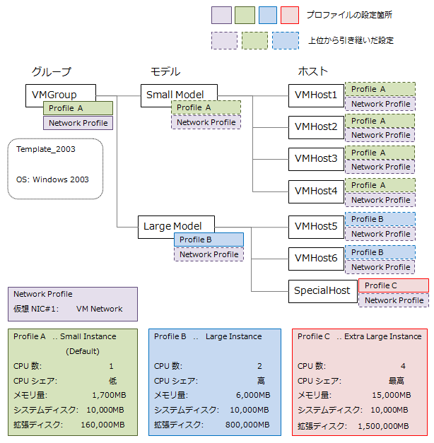 グループVMGroup配下には、Small Model と Large Modelの2つのモデルを用意します。モデルSmall Modelには上位のグループVMGroupの設定としてマシンプロファイルProfile Aが引き継がれるように設定します。モデルLarge Modelは、高負荷な業務に対応できるように高いスペックが定義されているマシンプロファイルProfile Bを、設定します。ネットワークの設定については両方のモデルともグループVMGroupの設定を引き継ぐようにします。