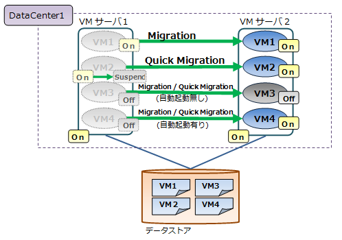 Migration / Quick Migrationは、移動元と移動先の仮想マシンサーバが共有しているデータストア上に移動対象の仮想マシンが配置されている場合、仮想マシンを指定の仮想マシンサーバに移動させることができます。データストアの配置を変更することはできません。
